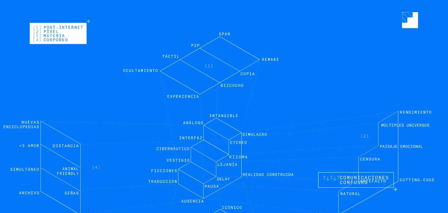 •Tecnofacturas: Contempla una serie de artesanías cibernéticas y colaboraciones entre humanos y máquinas, las maneras en cómo nos relacionamos para con ellas y las particularidades entre una realidad construida por materia y otra por píxeles. Recalcando la actual hibridación entre lo material y lo virtual, en la cual estamos inmersos.