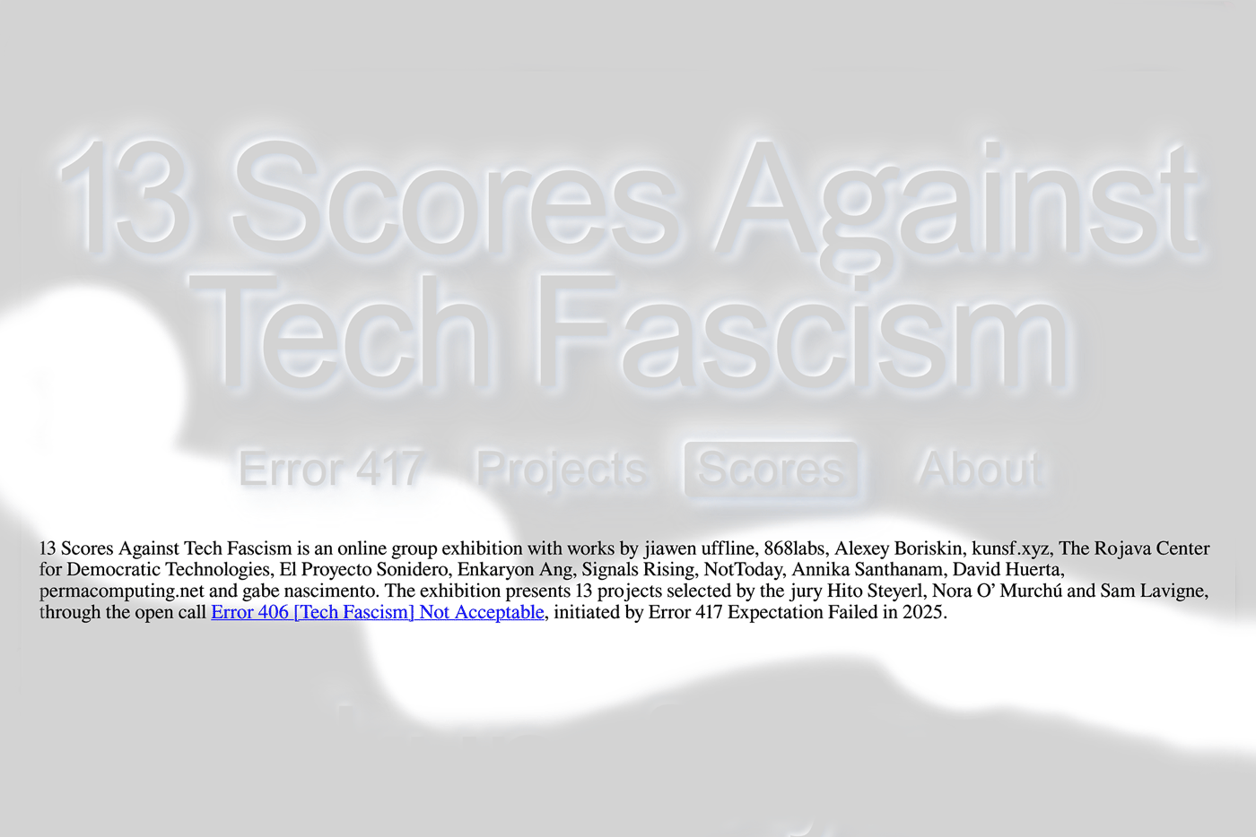 obra seleccionada por Hito Steyerl, Nora O’ Murchú y Sam Lavigne, a través de la convocatoria abierta Error 406 [Tech Fascism] Not Acceptable, iniciada por Error 417 Expectation Failed en 2025.