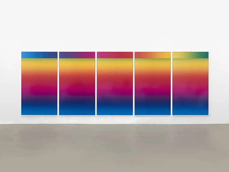 Photoshop CS: 84 by 240 inches, 300 DPI, RGB, square pixels, default gradient “Spectrum”, mousedown y=25130 x=35700, mouseup y=0 x= 35700; tool "Wand", select y=1420 x=4237, tolerance=80, contiguous= off; default gradient "Spectrum", mousedown y=1230 x=0, mouseup y=1230 x=71710, Cory Arcangel, 2018